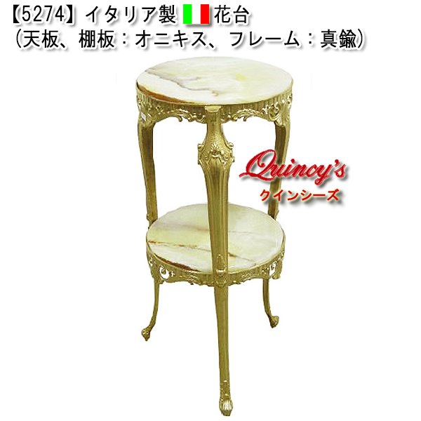 【5274】イタリア製花台 丸型(天板、棚板:オニキス、フレーム:真鍮)